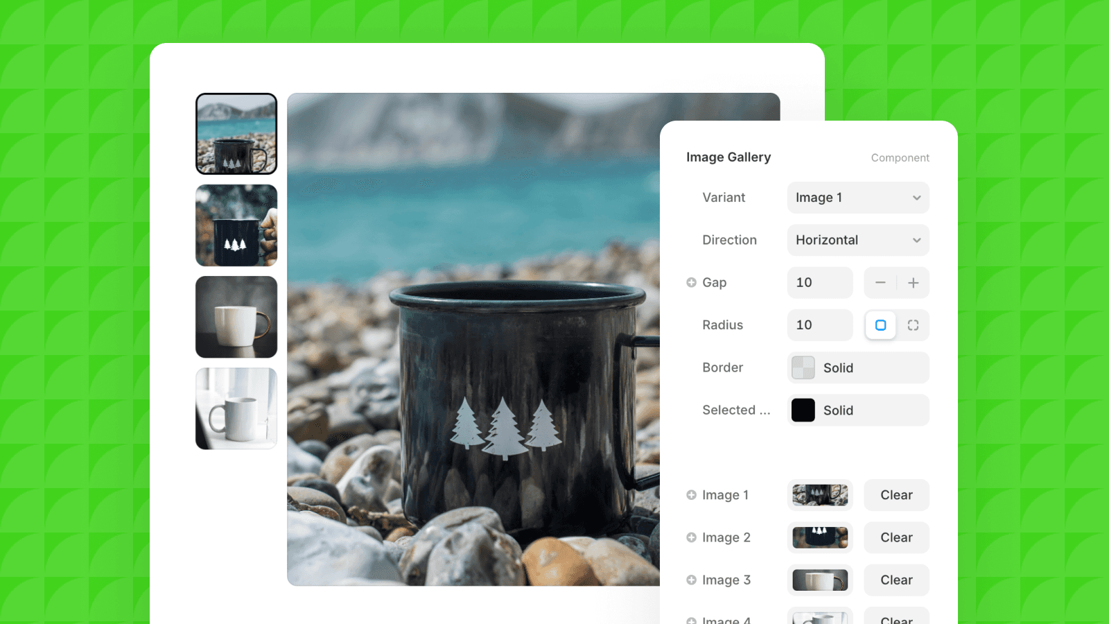You can now customize the radius, borders, gap and direction of your image gallery without unlinking the component.